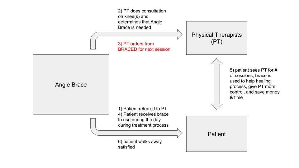 Below are two diagrams that show the flow of cash as our ideal customers interact with their patients (our end users). The first shows the interaction between BRACED, orthopedic surgeons, and patients and the second shows the same but for out physical therapist market.