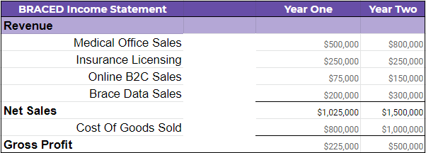The BRACED Gross Income Statement outlines our predicted revenues and COGS for a high level gross profit overview. Outlined are our revenue sources and approximate Cost of Goods Sold based on costs associated with fulfilling each revenue source.